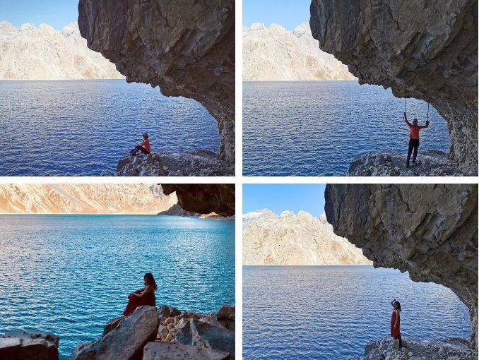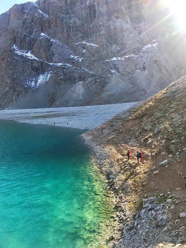有阳光照射的地方,水是透的,晶莹闪烁,背光的地方,水是重色的,深邃幽蓝。在我觉得我快要不行的时候,他们跑到下面脱衣服去了,告诉我,为什么玩户外的男人到了打卡地都喜欢光膀子来个到此一游~为什么。