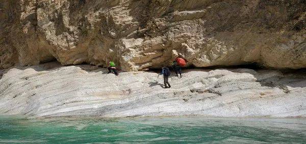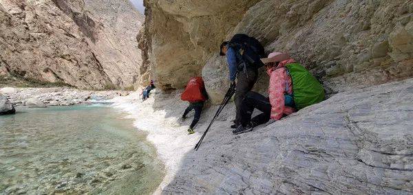 刚拐弯就遇到一个要爬崖壁的,简直是难度系数十颗星,手脚并用还是很刺激,那些个白色闪闪发光的石头,很好看但是不好爬啊!我怀疑领队在增加难度,但是我没证据。后来山说,看我们一群翻崖壁那个难啊,小脑发育不够,下面的崖壁改成趟河了?正合我意。