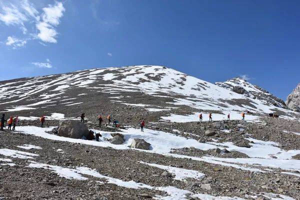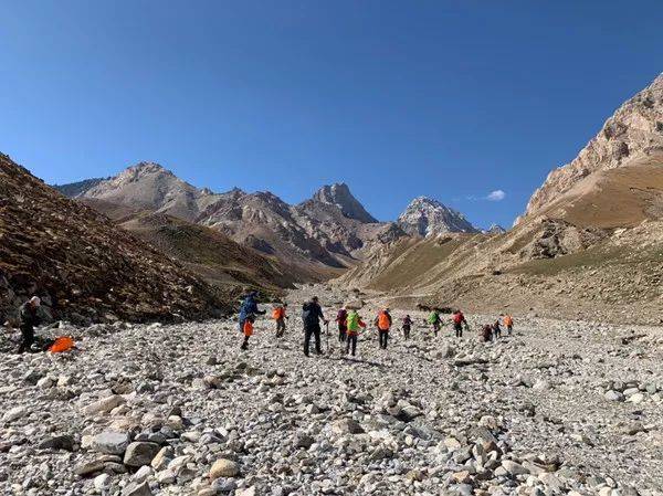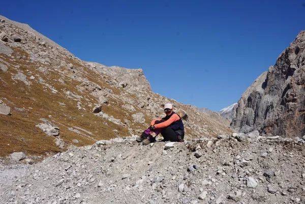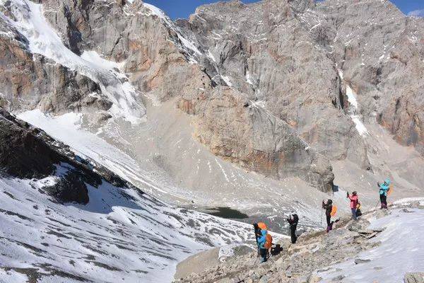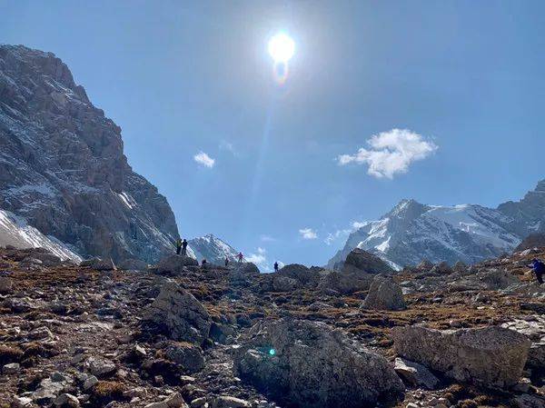 一路走,一路回头看雪山,这段路太累了,走几步我就得歇歇,最后默默掏出我背了几天不舍得吃的一个橘子,一瓣一瓣的吃着,橘子的香味支撑着我走了好远一段路。这段路队伍的前队和后队拉的距离有点远,每次抬头看前面的小人,绝望。不过这几天我锻炼出了一个徒步好心态是真的,拉在队伍最后我也不急了,走在队伍最前我也不赶~既然跟了队伍就得有一个队伍的合作精神,因为你不是一个人在走,队伍里每个人的节奏和素质都不一样,领队不好做啊。