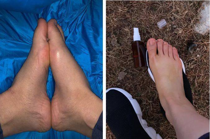 第一天全程溯溪鞋,鞋底软,鞋带不舒服,感觉右脚可能是扭到了,第二天脚一直有隐隐的疼,但是能忍,晚上就拉伸按摩下,然而第三天一早悲催的发现右脚肿了,连脚指头都是肿的,赶紧找队长要了要喷,不然还有四天行程,可咋办啊。