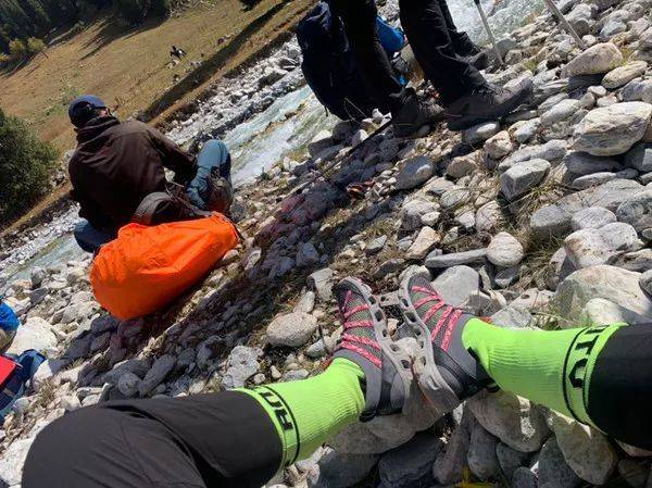 亲身对比了一下防水袜跟徒步袜的区别,左脚右脚一样一个,后来过了大概二十次河,防水袜没那么冰,但是走路的时候水出不去,徒步袜不会存水,但是进水瞬间特别冰,但是,过河是个很有意思的事情。