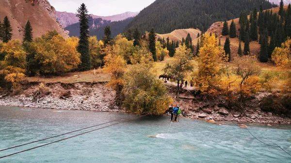走出没多远就到了溜索,清澈见底的科克苏河是划分南北疆的界河,河岸以南是维族牧民地盘,北岸是哈族地盘儿。过了溜索就是营地了,开心。溜索还挺刺激的,哗的一下靠篮子自重就到河中间了,然后队友就喊,行了,不用管了,让她们待在那吧~都是中国好队友,然后对岸有人使劲拉啊拉啊,如果超重的话,拉的人就会很辛苦。