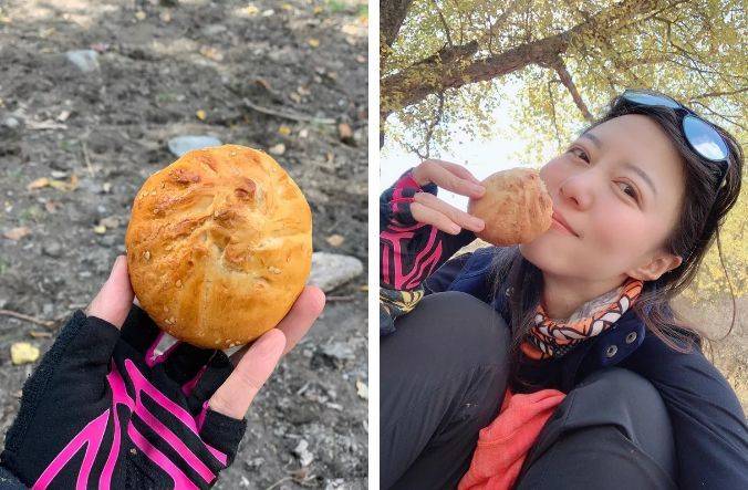 路餐里的小可爱,我以为是烤包子,结果咬开是葡萄干馕,出乎意外地好吃。领队说路餐都是领队自己去购买的,他给我们准备的馕有五六个味道的,有玫瑰蜂蜜的,有核桃的,有辣的,有正常的~还有红糖姜茶和新疆本地的咸奶茶,巧克力糖果也都有,领队用心了。
