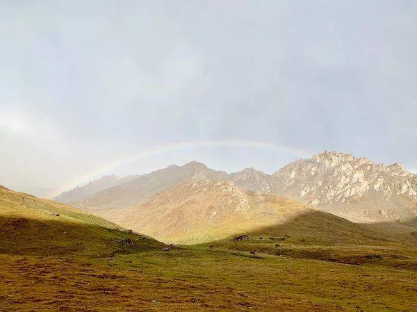 终于到营地了,经历了风雨里的扎营和小冰雹的洗礼,大家都拖着疲惫的身体在帐篷里休整保暖,这时候上天送了个惊喜出来~不知道谁喊了一声有彩虹,我们从帐篷中探出头,美呆,我在心里默默开心,谢谢~