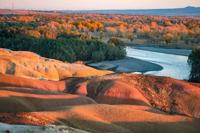 张掖往西,新疆的西北偏北,阿勒泰在落日余晖时分,会呈现出一种壮美。夕照流苏,山丘便摇身一变,往昔的沧桑荒凉,化作五彩缤纷的华丽。偌大的新疆,夕照里的主角却仿佛只有它。