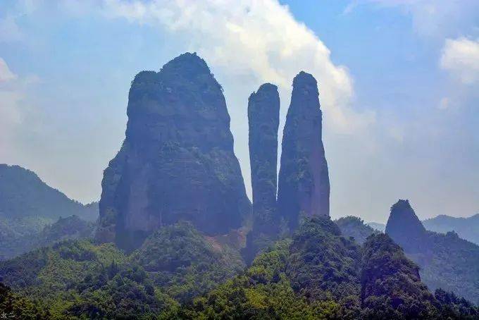江郎山,相传是古代姓江的三个兄弟登上山顶变成的三大巨石郎峰、亚峰、灵峰,自北向南呈“川”字形排列,高360多米, 雄伟奇特如刀砍斧劈,素有“雄奇冠天下,秀丽甲东南”之誉。