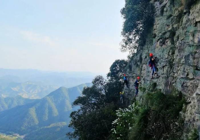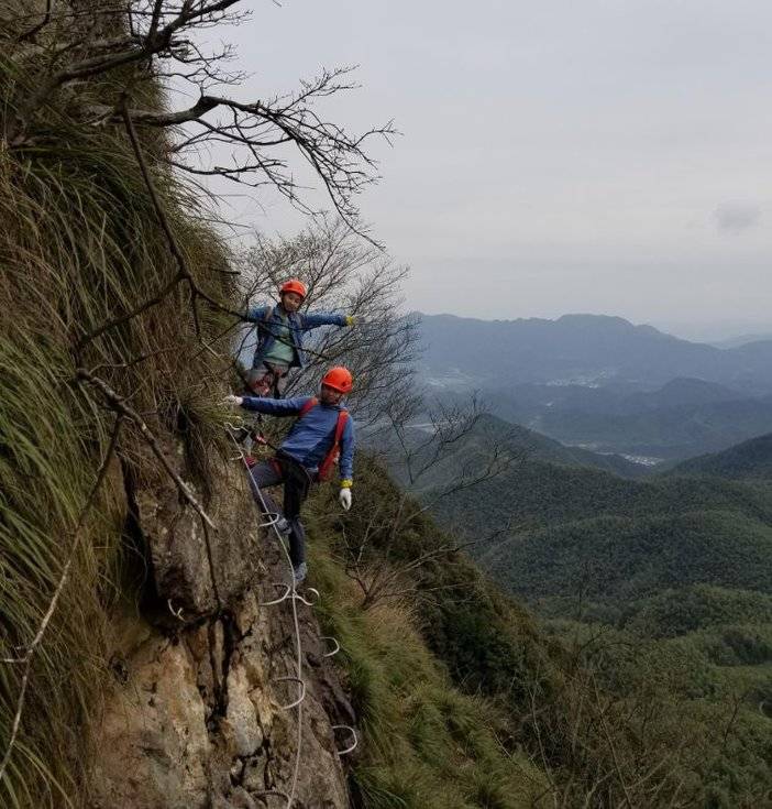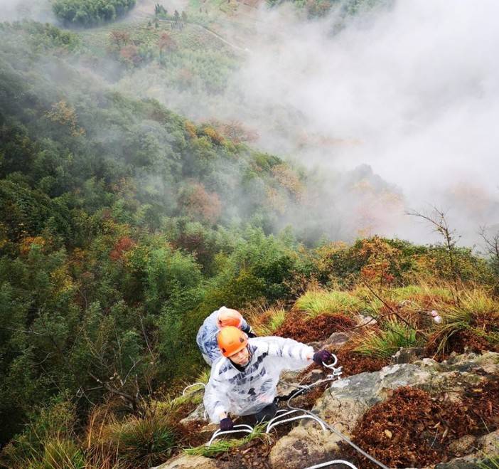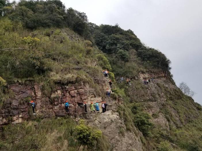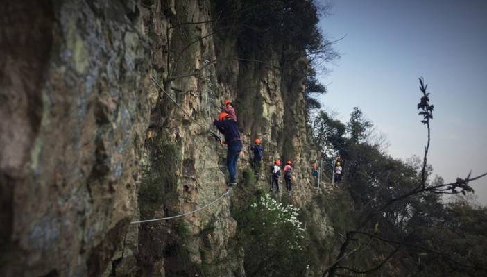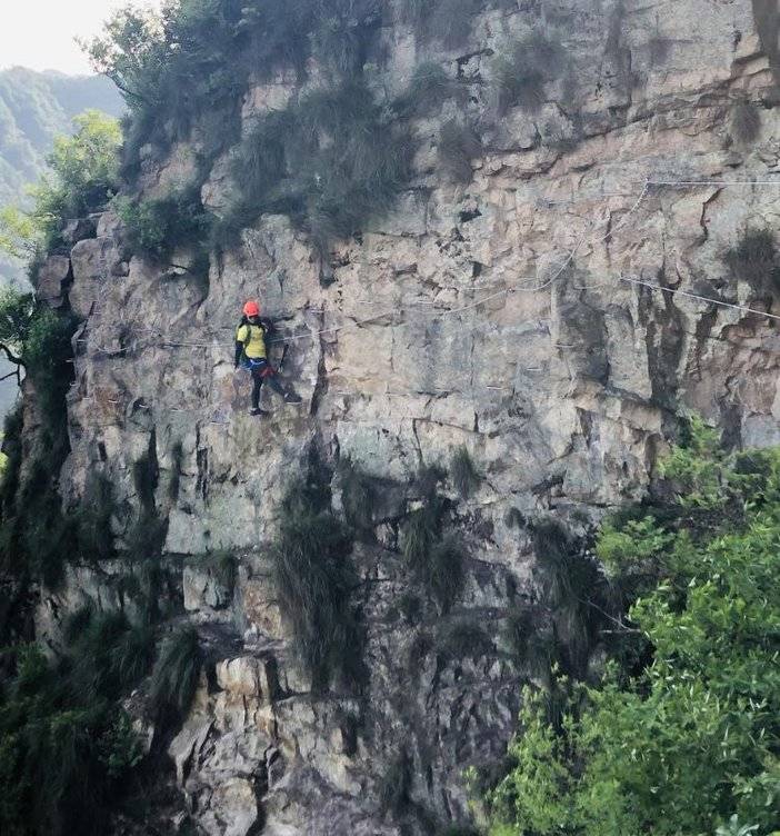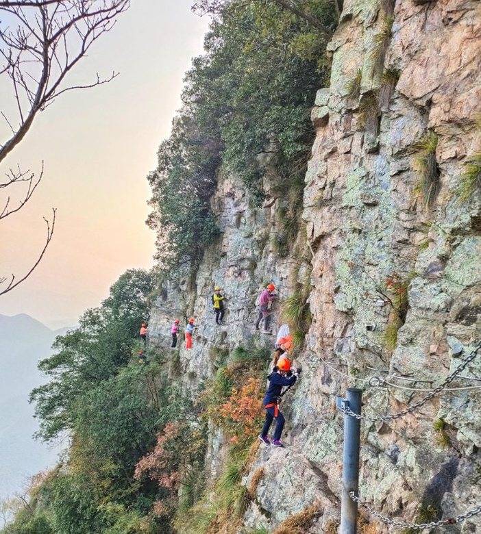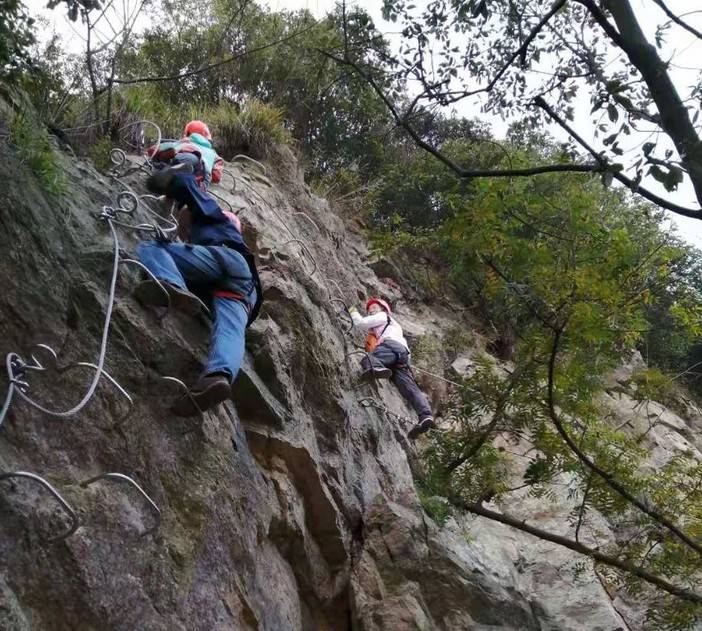 这是修建在岩壁上、利用铁索、脚蹬的辅助,进行峭壁攀爬的一种攀岩方式!