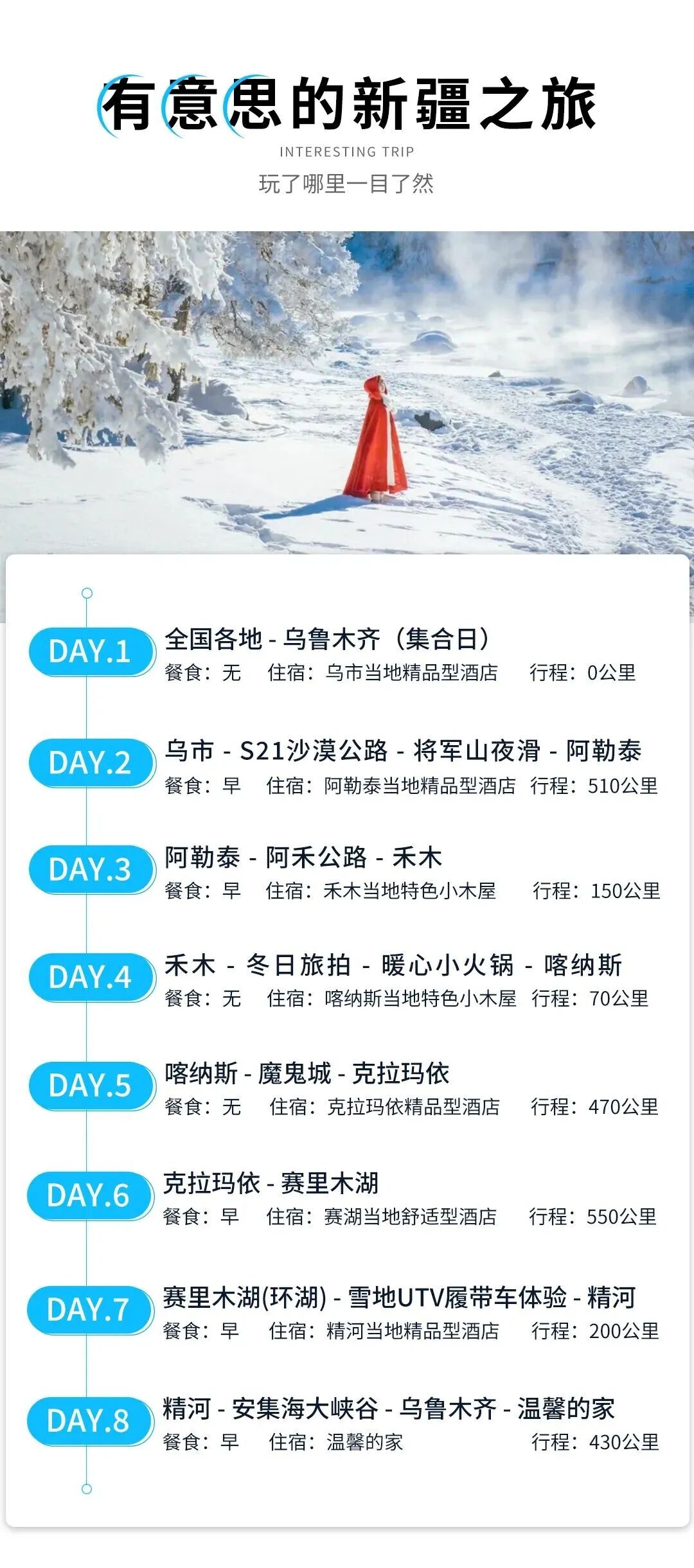 1. 新疆气候干燥,各景区温差较大,游客出发前应注意收听收看目的地的天气预报,以便增减衣物。冬季行程温度在零下25到零下10度之间。请按照此温度,准备好衣服,雨具等。