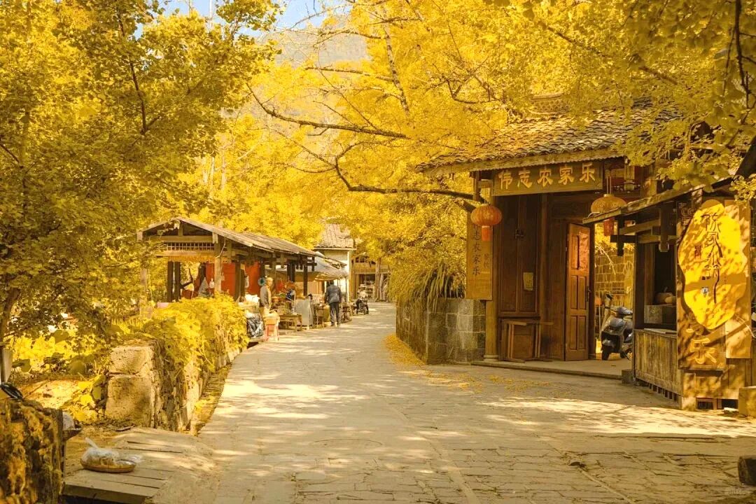适时前往【江东村银杏村】。这里,是宛如天堂的静谧秋景;这里,是冬季里的金色梦想; 这里,是电影《武侠》的拍摄地;这里,是天堂的后花园,这里"村在林中,林在村中"相互依托;这里,是天下第一银杏王国。每到深秋,房前屋后,黄叶纷飞,异常美丽。珍贵的百年银杏树让这个小村庄显得古朴和深邃。