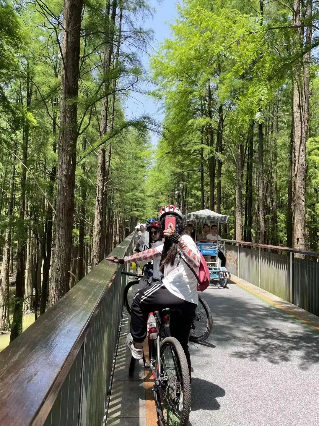在【青山湖】尽情享受从湖边吹来的湖风,畅骑颜值爆棚的环湖绿道,视野非常开阔,到风景最美的一段,我们停下来打卡拍照,尽情玩耍。