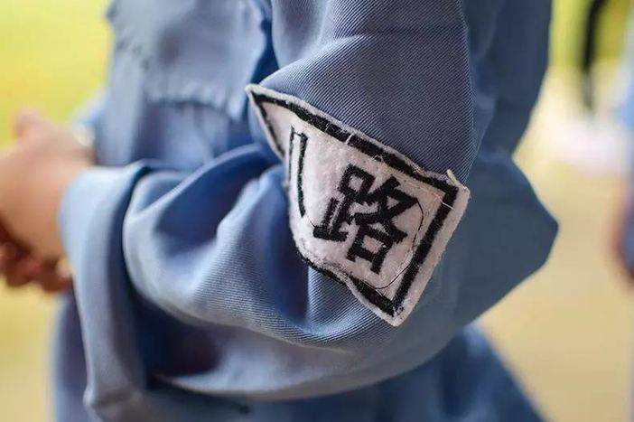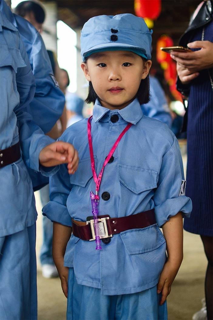 父母在一旁观看小小八路撕名牌
