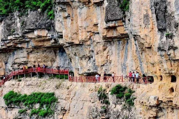 洞窟之间全靠架设在崖面上的凌空栈道通达