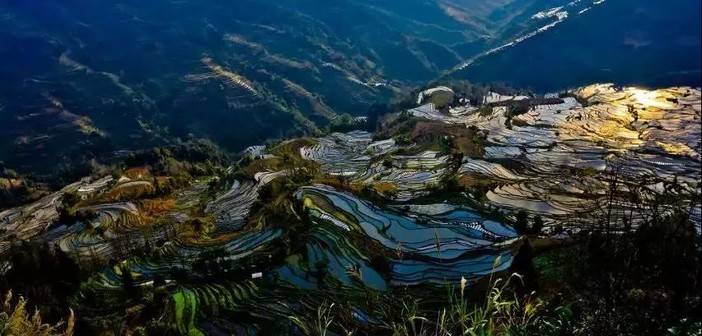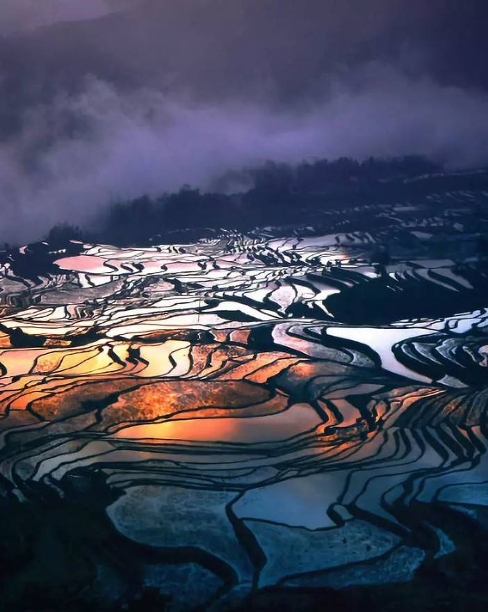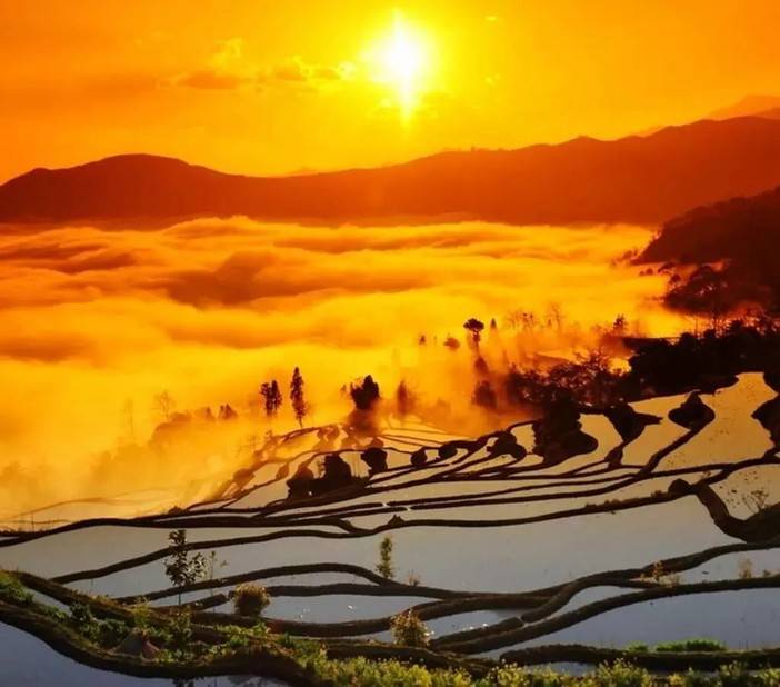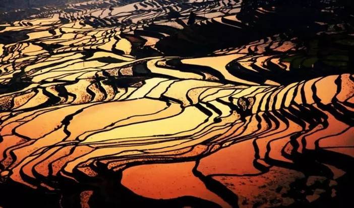 灌了水的梯田,水光交叠,波光粼粼,甚是壮观震撼;