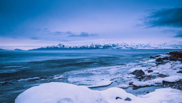 远处的雪山,近处的冰山,远处的蓝天,近处的“碧水”,似乎是一位杰出的画家的倾心画作。