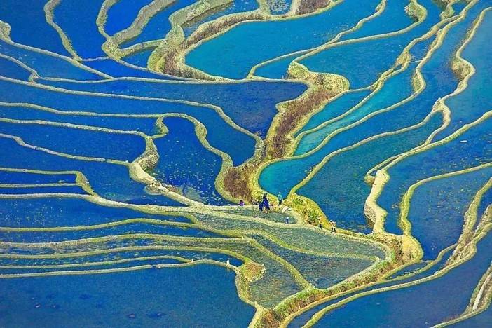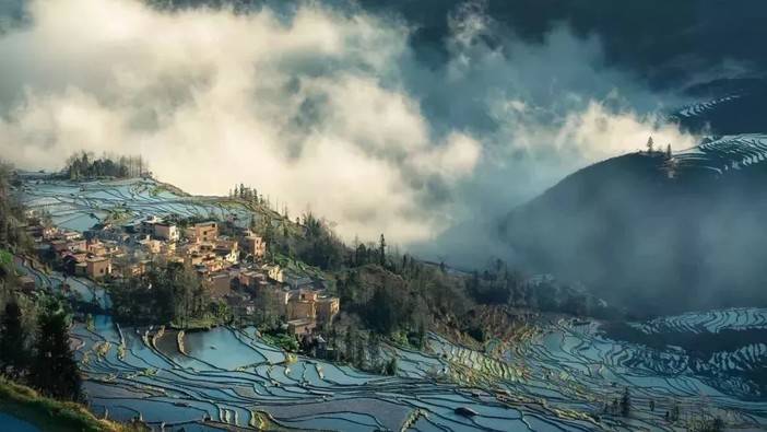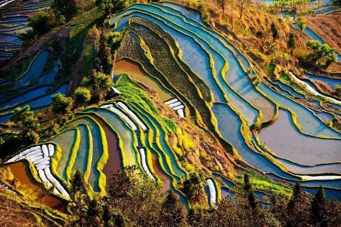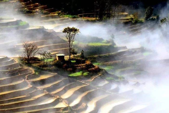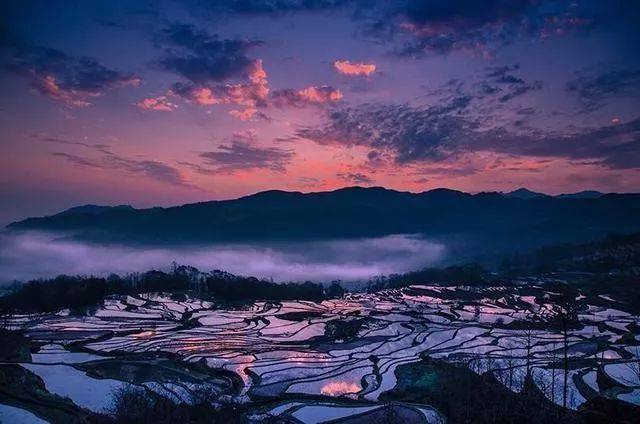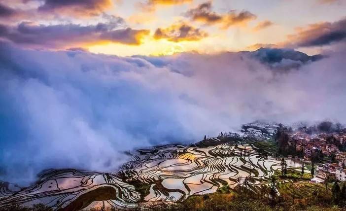 层层梯田银波荡漾,倒映着白云蓝天,树木山川,像极了一块块精美的彩色玻璃,并且这个时候看到云海和彩霞的机率的也比较大。