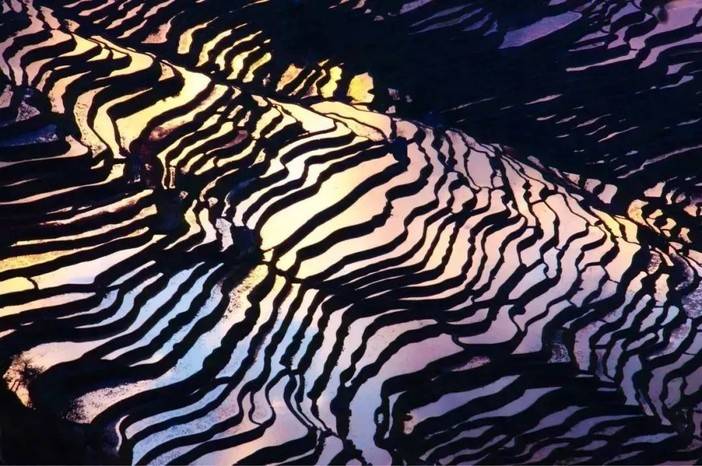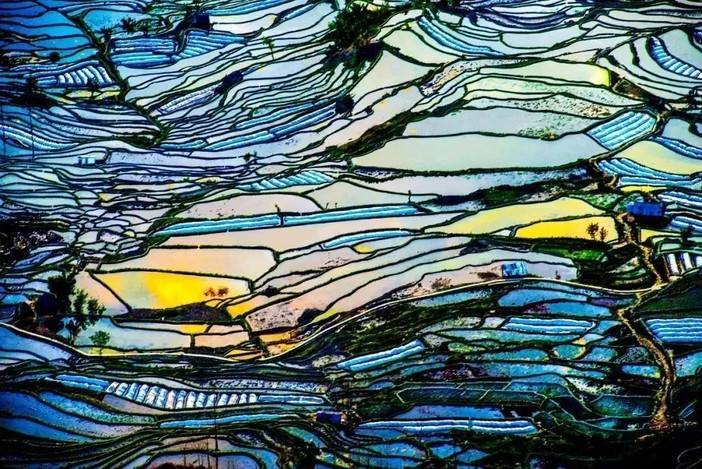待到太阳升起,随着光线的变化,一块块梯田像极了彩色的碎片,让人恨不得把它们拼接起来,构造出一幅完整的光影图。