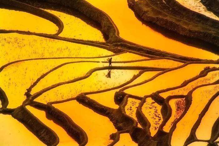 等到雾气消散,看天际的阳光一点点绽放,梯田从黑暗到绚烂夺目,一条条错落的线条柔美动人,勾勒着晨起最耀眼的时刻。