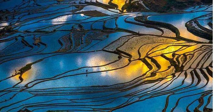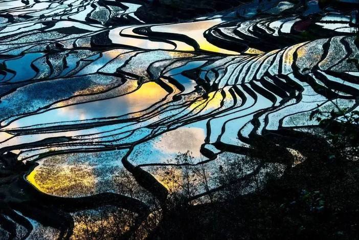 天边彤云万丈,霞光闪耀,水色盈盈,光彩照人,从金黄到火红,梯田好像使出浑身解数,要把最后的辉煌,留给人间。
