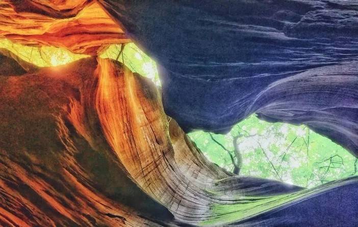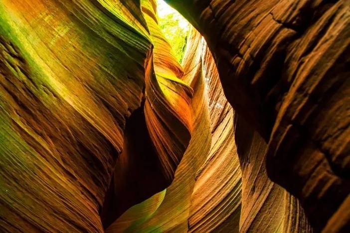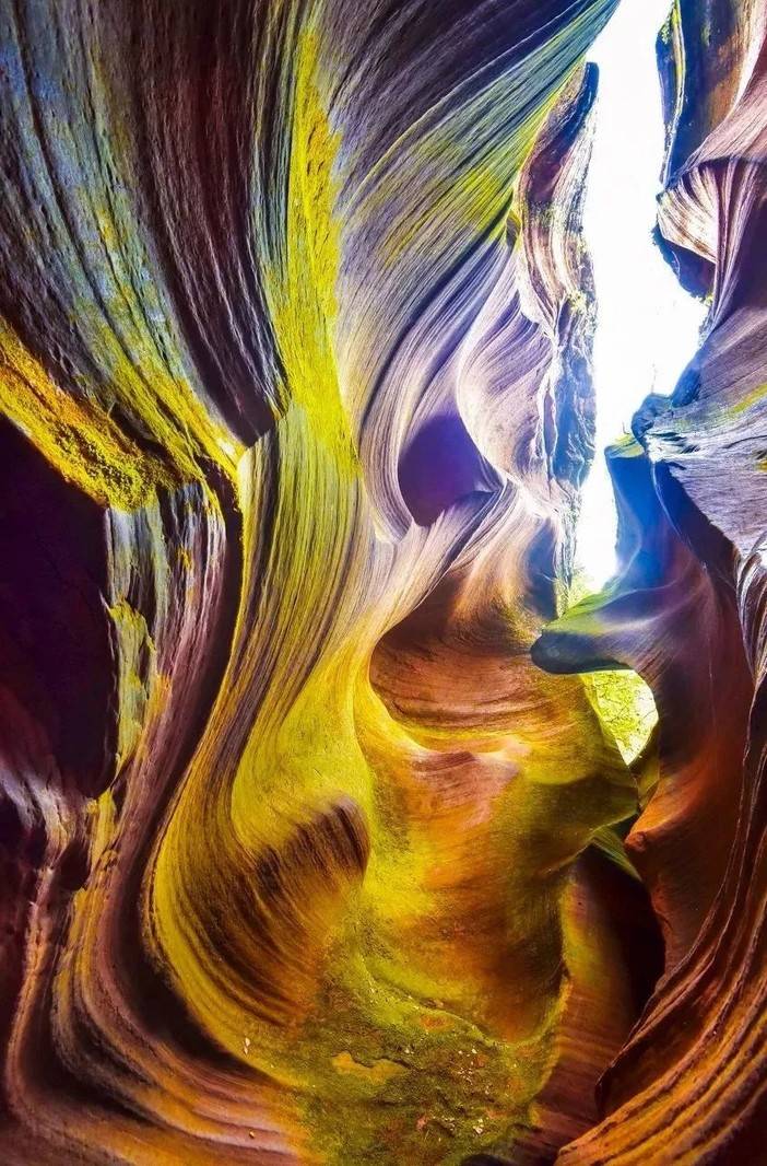 阳光在奇异复杂的岩石上,刻划出一层层、一幅幅流畅的波纹曲线,并在岩壁上折射出五彩缤纷的迷人色彩!
