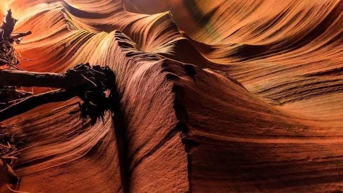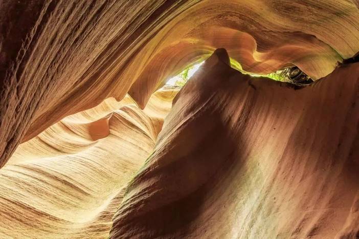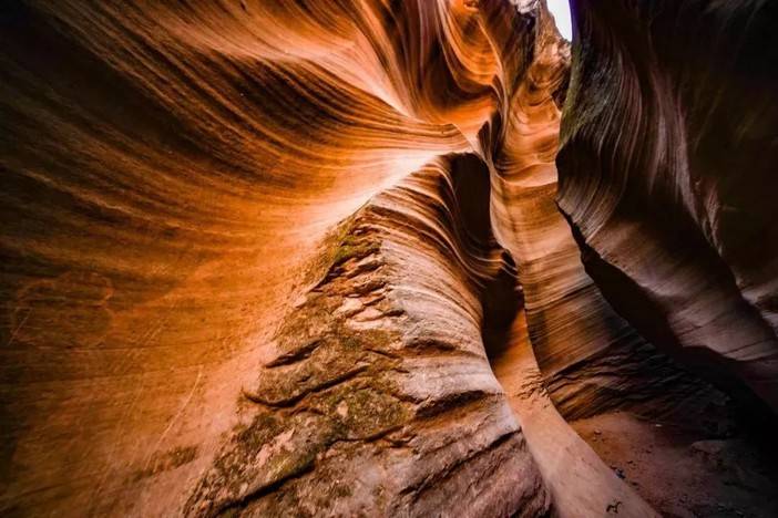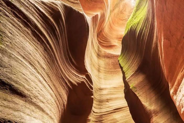 它如同一个美妙的艺术宫殿,谷壁看似轻柔,实则非常坚硬岩石表面,像被精心打磨,纹层顺着岩壁流淌!