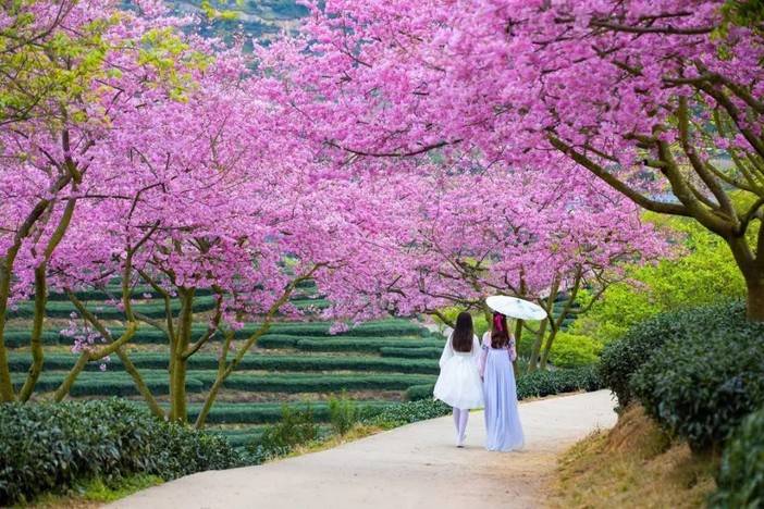 每到春天花季,沿途开满花朵的枝枝树桠,摇曳不定。一个转弯,映入眼帘的不仅有布满枝头的粉色花卉,还有空中扬起的无数花瓣。
