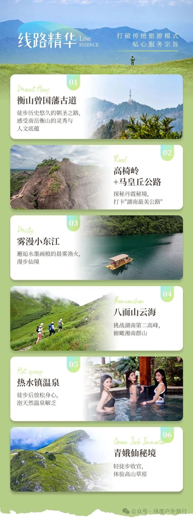 酒店早餐后出发(车程1.5小时至登山口)八面山徒步挑战(往返约9公里)我们将拾阶而上,沿路溪流,瀑布,森林,高山草原感受海拔上升不同的植被变化。顶峰可360°观三省风光,云海季更壮观(如遇八面山森林防火期不对外开放,我们将根据情况改走齐云山,风景和徒步强度同八面山一样)徒步结束后集合前往桂东县城(车程2小时)。