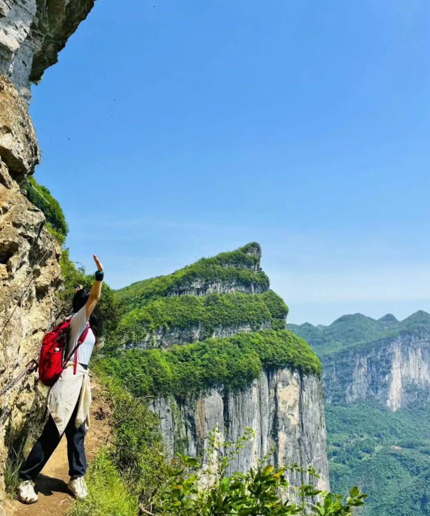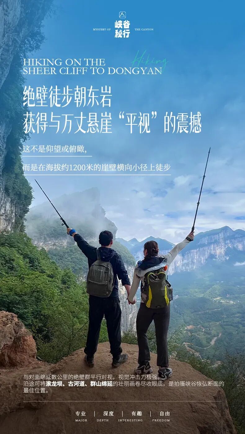 前行地势渐升,朝东岩绝壁乍现,冷峻威严。沿着先辈开凿的狭窄栈道向崖顶攀爬,脚下深渊万丈,山风呼啸,每一步都需勇气与专注,心跳加速,豪情与敬畏感顿生。
