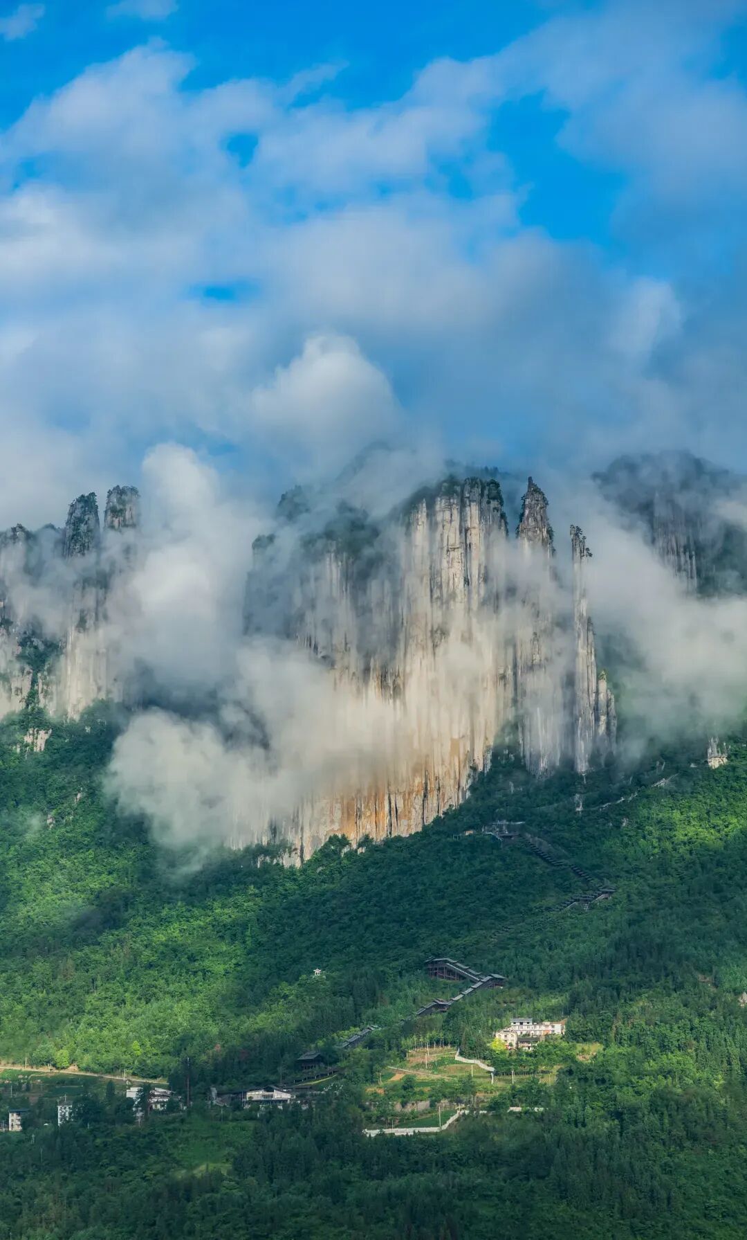 登顶瞬间,仿若踏入仙境,视野大开。连绵山脉似绿浪奔涌,云海翻腾裹山峦,远处村落炊烟袅袅。俯瞰来路,小道隐匿山林绝壁间,成就感与感恩溢满心间。