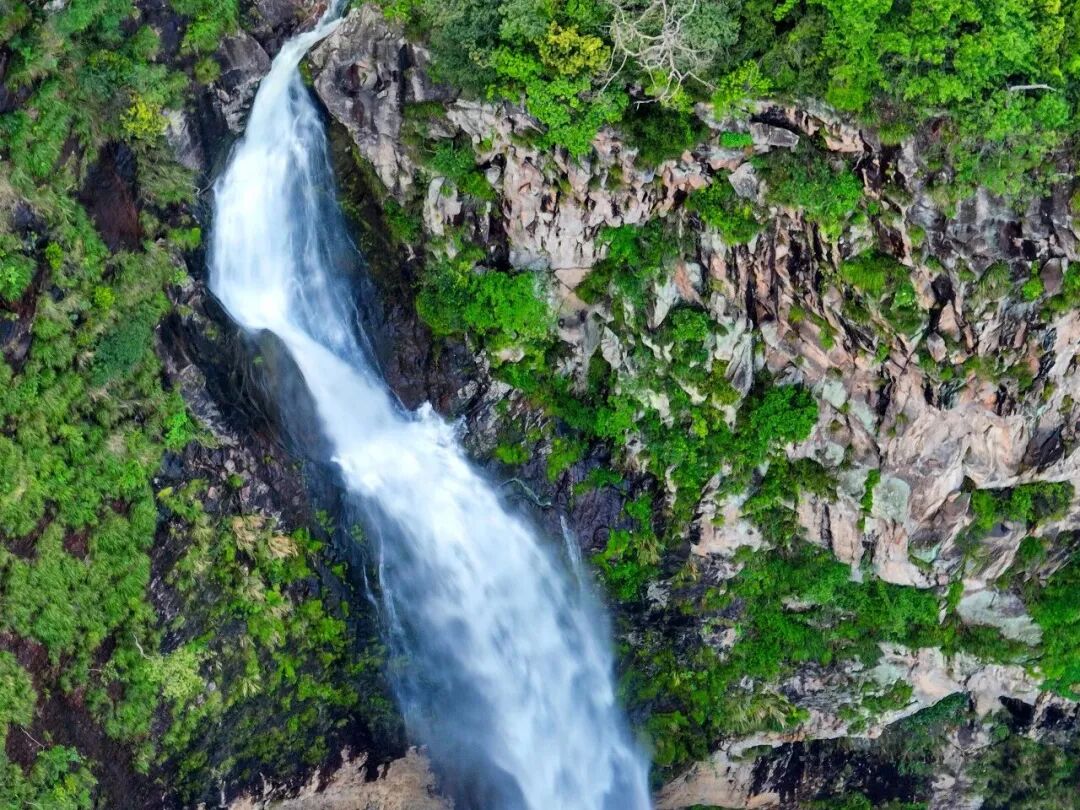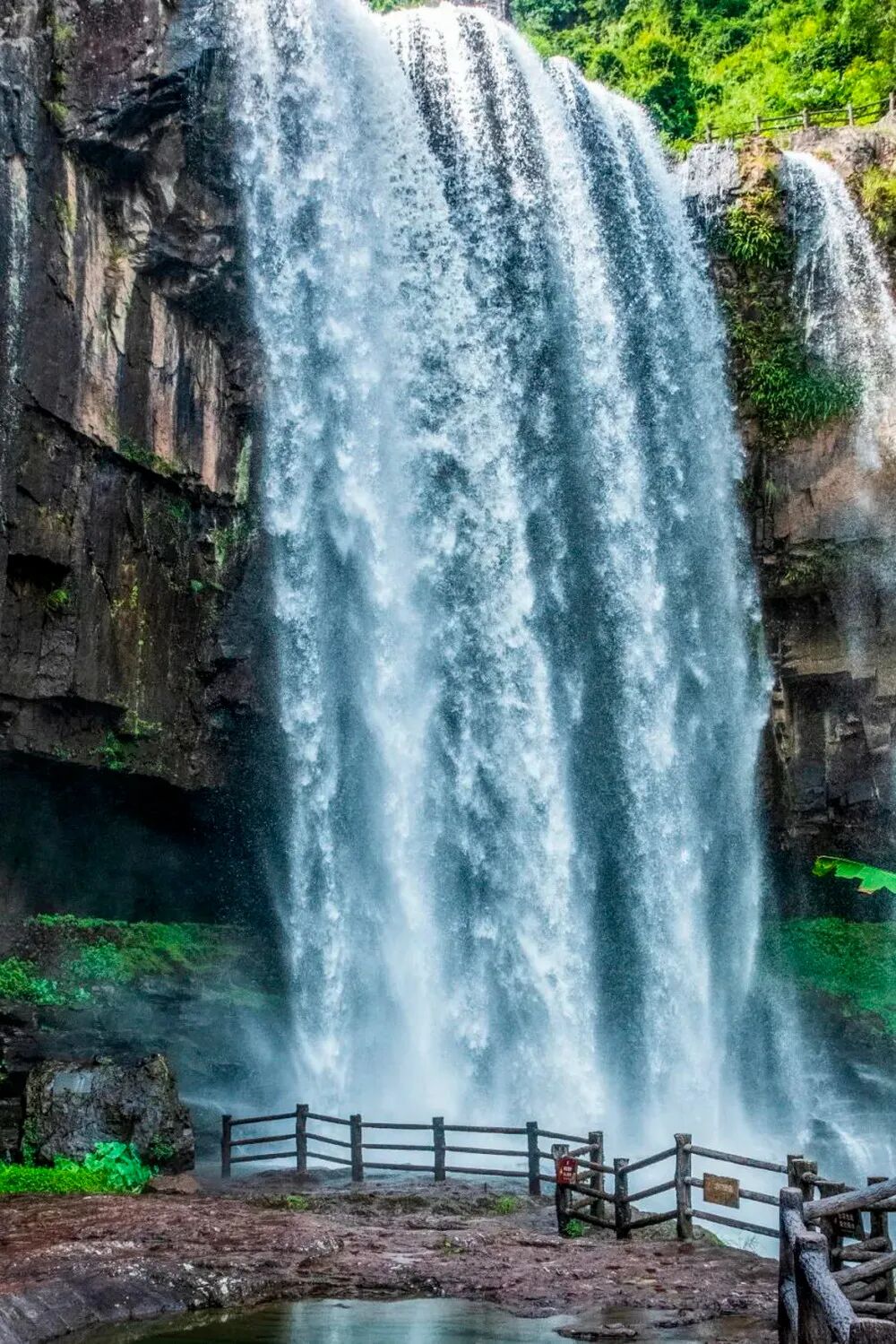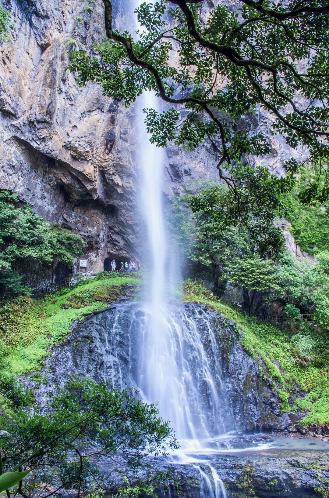 石门洞的“洞天飞瀑”。宽约五米的水流自112.5百米高的悬崖奔腾直下,声若雷鸣,水势磅礴。